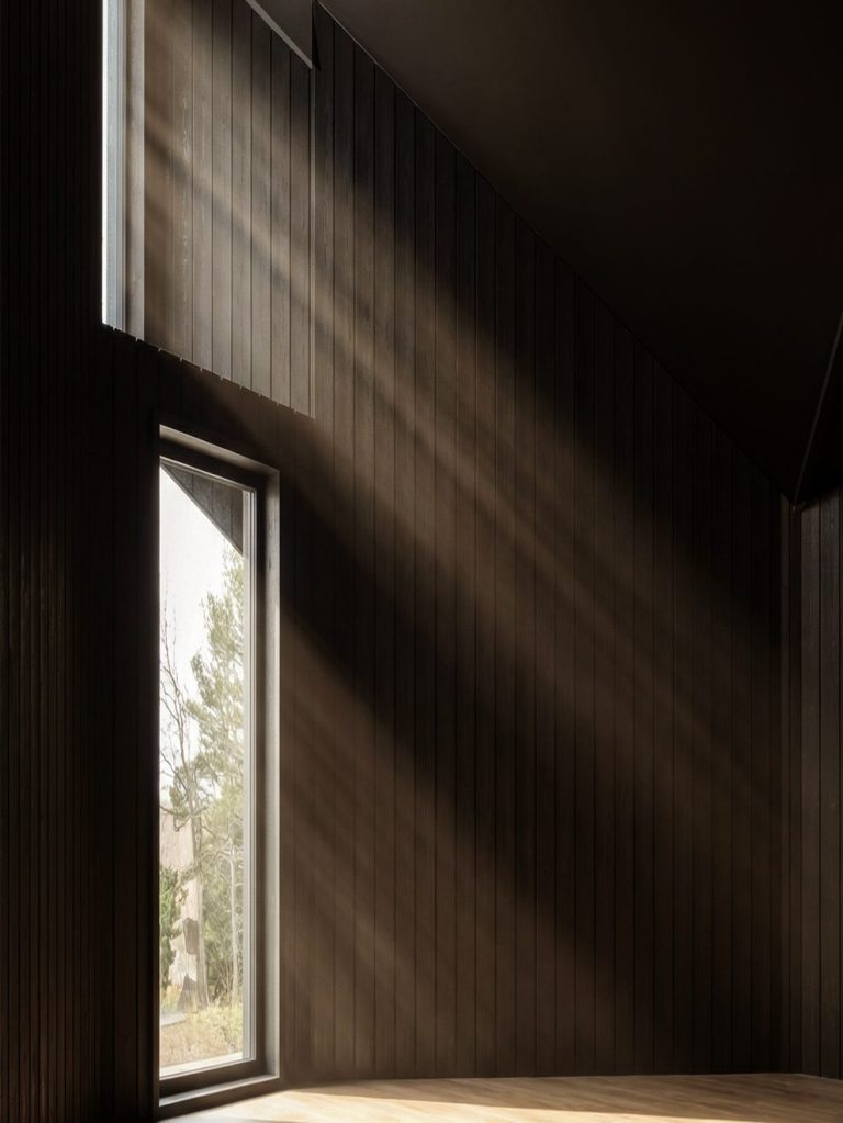 Внутри — непрерывный вид на лес с трёх сторон. Снаружи — скульптурная строгость, за которой скрыта сложная инженерная работа с рельефом.