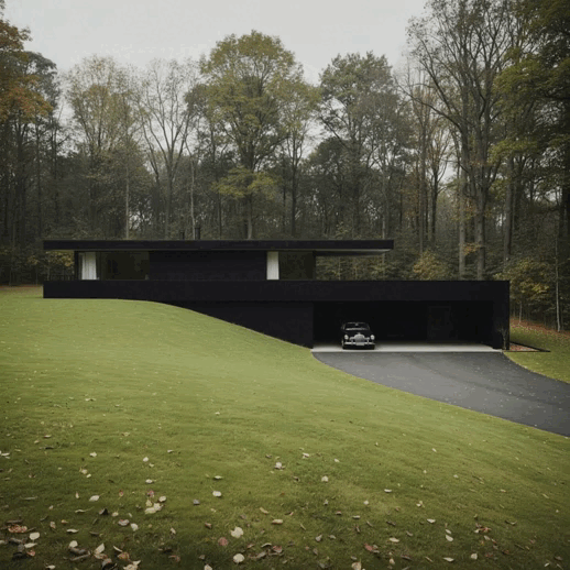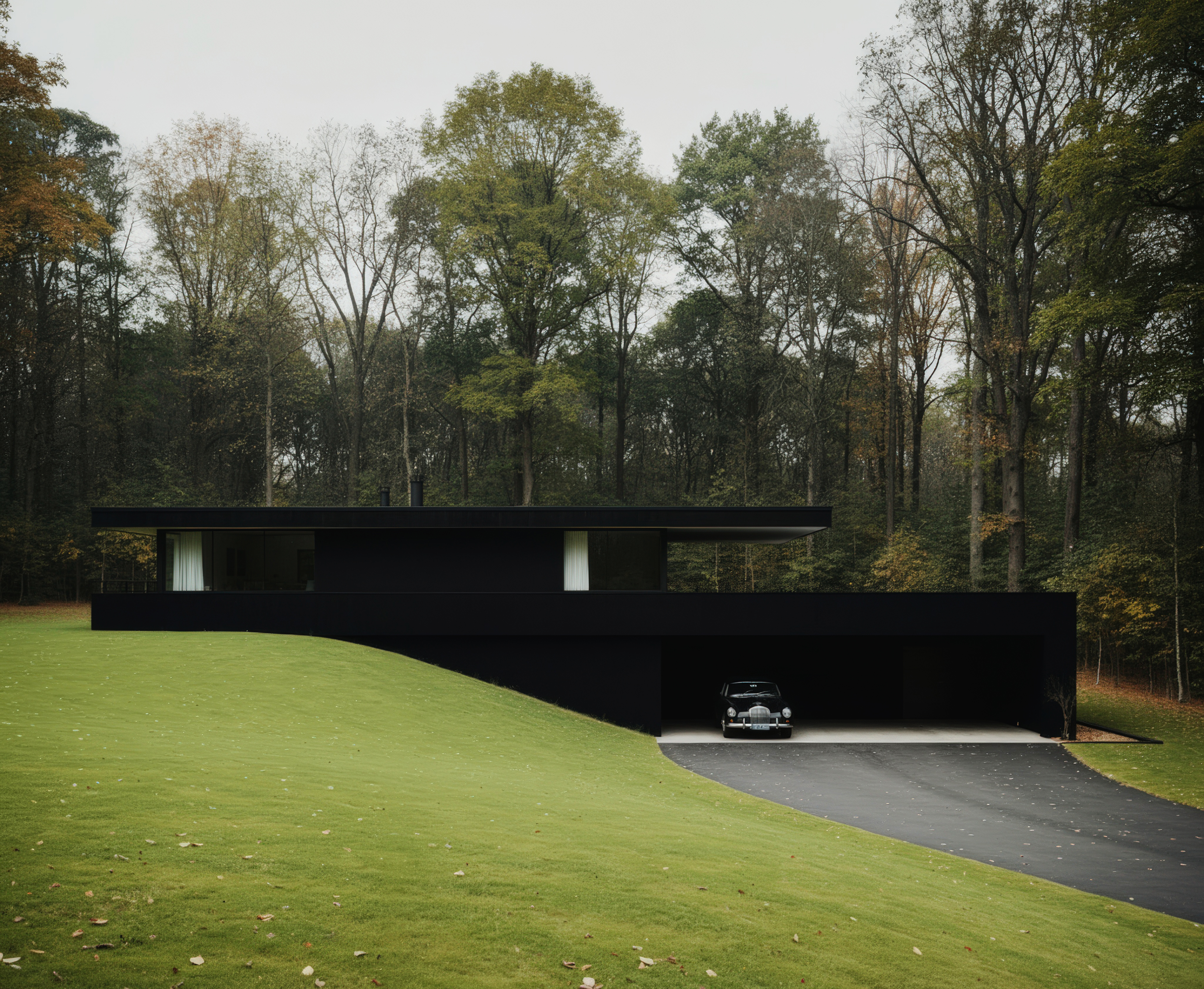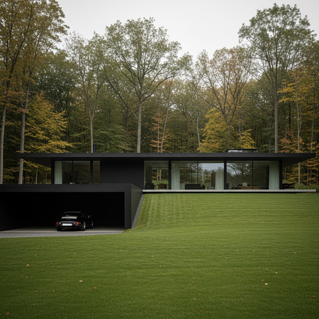 Верхний уровень — горизонтальный объём с плоской кровлей и панорамным остеклением во всю длину фасада. Дом не конкурирует с лесом — он растворяется в нём, отражая осеннюю крону в своих стёклах. Тёмный фасад — намеренный выбор: графичная рама, которая делает природу главным героем.